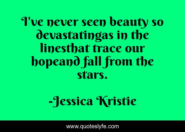 This page presents the quote "I've never seen beauty so devastatingas in the linesthat trace our hopeand fall from the stars.". Author of this quote is Jessica Kristie. This quote is about poems-on-life, poetry, poetry-life, poetry-love, poems, micropoetry,.