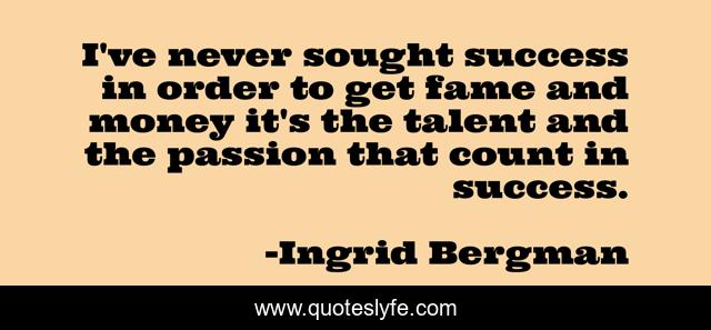 This page presents the quote "I've never sought success in order to get fame and money it's the talent and the passion that count in success.". Author of this quote is Ingrid Bergman. .