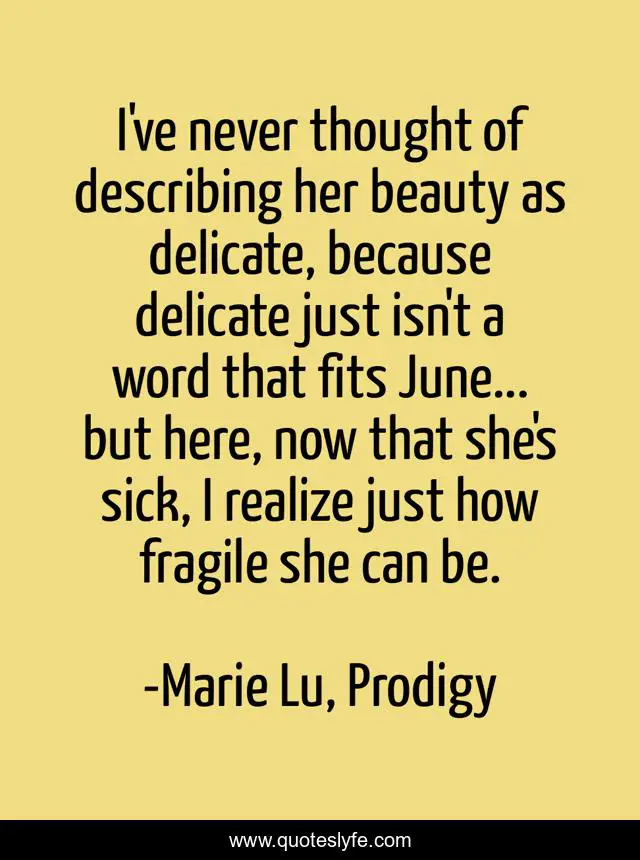 This page presents the quote "I've never thought of describing her beauty as delicate, because delicate just isn't a word that fits June... but here, now that she's sick, I realize just how fragile she can be.". Author of this quote is Marie Lu, Prodigy. This quote is about fragile, june, day, sick, delicate,.
