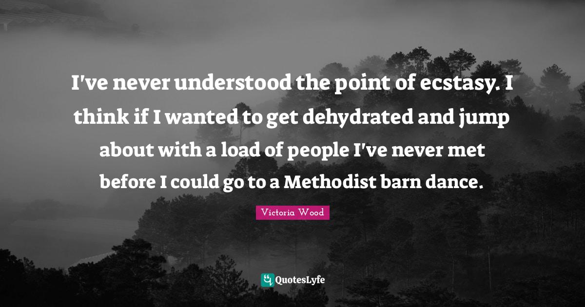 This page presents the quote "I've never understood the point of ecstasy. I think if I wanted to get dehydrated and jump about with a load of people I've never met before I could go to a Methodist barn dance.". Author of this quote is Victoria Wood. This quote is about understood, dance, people, funny, ecstasy, wanted, thinking, load,.
