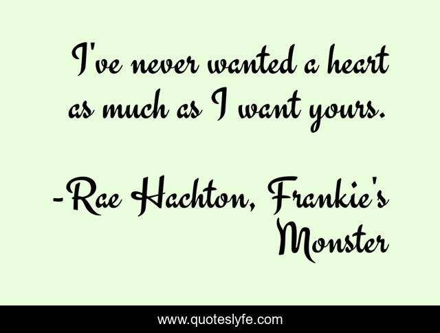 This page presents the quote "I've never wanted a heart as much as I want yours.". Author of this quote is Rae Hachton, Frankie's Monster. This quote is about romance, horror, love, horror-romance, affection,.