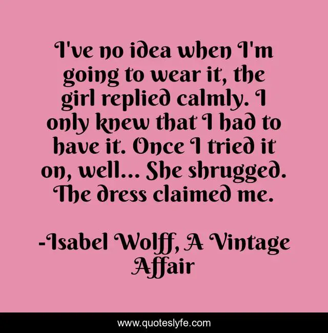 This page presents the quote "I've no idea when I'm going to wear it, the girl replied calmly. I only knew that I had to have it. Once I tried it on, well... She shrugged. The dress claimed me.". Author of this quote is Isabel Wolff, A Vintage Affair. This quote is about dress, style, fashion, shopping, vintage,.