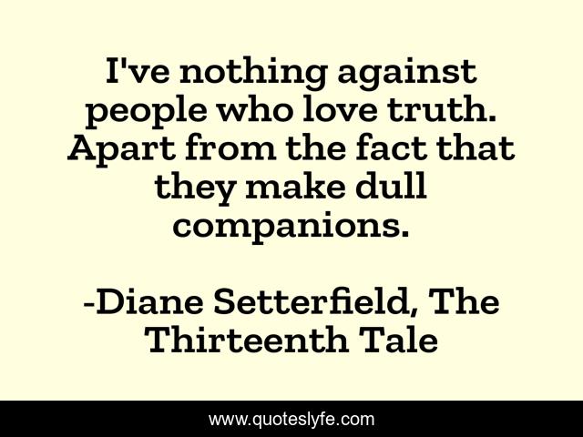 This page presents the quote "I've nothing against people who love truth. Apart from the fact that they make dull companions.". Author of this quote is Diane Setterfield, The Thirteenth Tale. .