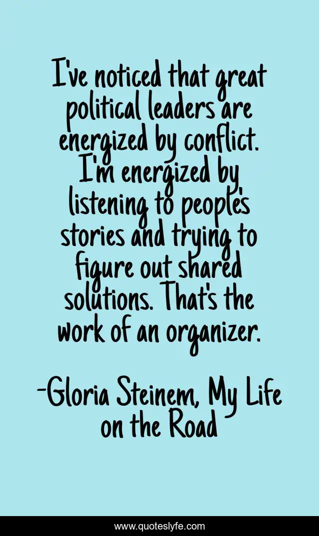 This page presents the quote "I've noticed that great political leaders are energized by conflict. I'm energized by listening to people's stories and trying to figure out shared solutions. That's the work of an organizer.". Author of this quote is Gloria Steinem, My Life on the Road. This quote is about sharing, organizing, conflict,.