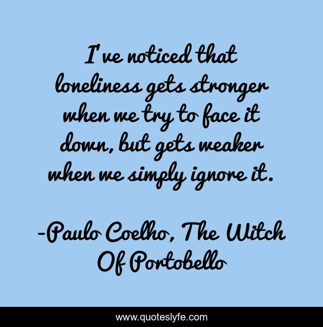 This page presents the quote "I've noticed that loneliness gets stronger when we try to face it down, but gets weaker when we simply ignore it.". Author of this quote is Paulo Coelho, The Witch Of Portobello. This quote is about coelho, loneliness, the-witch-of-portobello, fighting,.