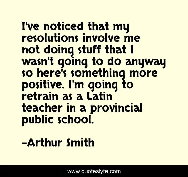 This page presents the quote "I've noticed that my resolutions involve me not doing stuff that I wasn't going to do anyway so here's something more positive. I'm going to retrain as a Latin teacher in a provincial public school.". Author of this quote is Arthur Smith. This quote is about me, positive, school, confidence,.
