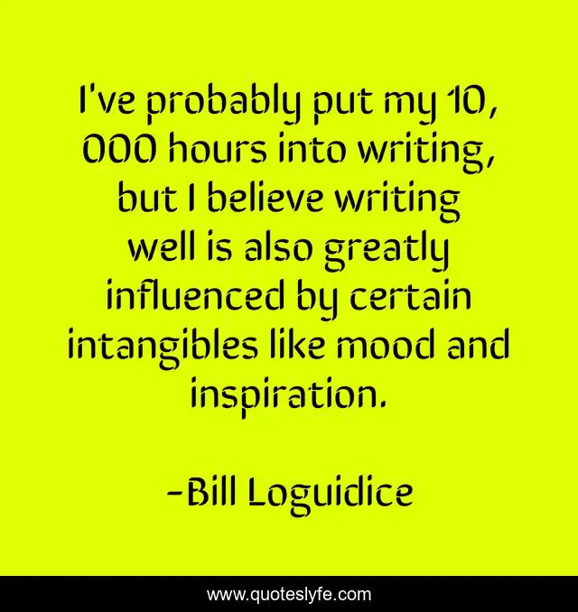 This page presents the quote "I've probably put my 10, 000 hours into writing, but I believe writing well is also greatly influenced by certain intangibles like mood and inspiration.". Author of this quote is Bill Loguidice. This quote is about writers, writing-life, writing,.