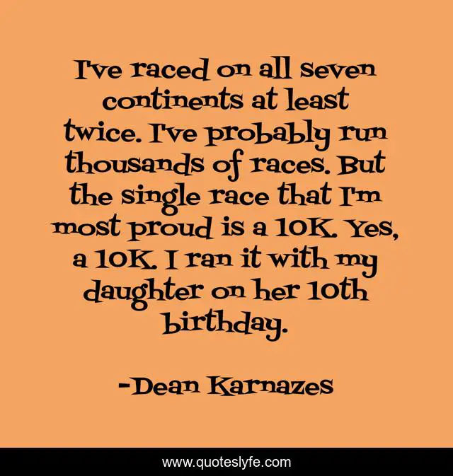 This page presents the quote "I've raced on all seven continents at least twice. I've probably run thousands of races. But the single race that I'm most proud is a 10K. Yes, a 10K. I ran it with my daughter on her 10th birthday.". Author of this quote is Dean Karnazes. This quote is about daughter, proud, run,.
