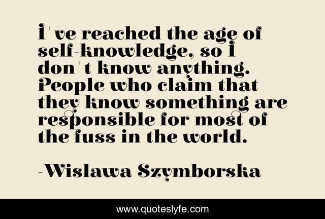 This page presents the quote "I've reached the age of self-knowledge, so I don't know anything. People who claim that they know something are responsible for most of the fuss in the world.". Author of this quote is Wislawa Szymborska. This quote is about world, people,.