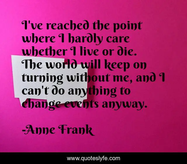 This page presents the quote "I've reached the point where I hardly care whether I live or die. The world will keep on turning without me, and I can't do anything to change events anyway.". Author of this quote is Anne Frank. This quote is about me, world, live,.