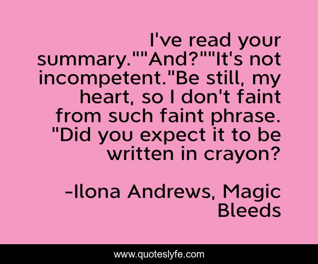 This page presents the quote "I've read your summary.""And?""It's not incompetent."Be still, my heart, so I don't faint from such faint phrase. "Did you expect it to be written in crayon?". Author of this quote is Ilona Andrews, Magic Bleeds. This quote is about ilona-andrews, magic-bleeds, kate, praise, saiman,.