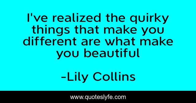 This page presents the quote "I've realized the quirky things that make you different are what make you beautiful". Author of this quote is Lily Collins. This quote is about enthusiasm, different, acceptance, beatiful, inspirational,.