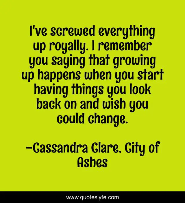 This page presents the quote "I've screwed everything up royally. I remember you saying that growing up happens when you start having things you look back on and wish you could change.". Author of this quote is Cassandra Clare, City of Ashes. This quote is about life, growing-up,.