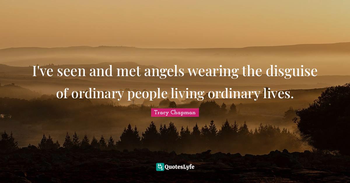 This page presents the quote "I've seen and met angels wearing the disguise of ordinary people living ordinary lives.". Author of this quote is Tracy Chapman. This quote is about ordinary people, life, positive, inspirational, ordinary, disguise,.