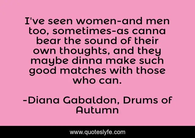 This page presents the quote "I've seen women-and men too, sometimes-as canna bear the sound of their own thoughts, and they maybe dinna make such good matches with those who can.". Author of this quote is Diana Gabaldon, Drums of Autumn. This quote is about loneliness, solitude, marriage, introvert,.
