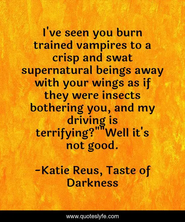 This page presents the quote "I've seen you burn trained vampires to a crisp and swat supernatural beings away with your wings as if they were insects bothering you, and my driving is terrifying?""Well it's not good.". Author of this quote is Katie Reus, Taste of Darkness. This quote is about werewolves, urban-fantasy-romance, paranormal-romance, dragons,.