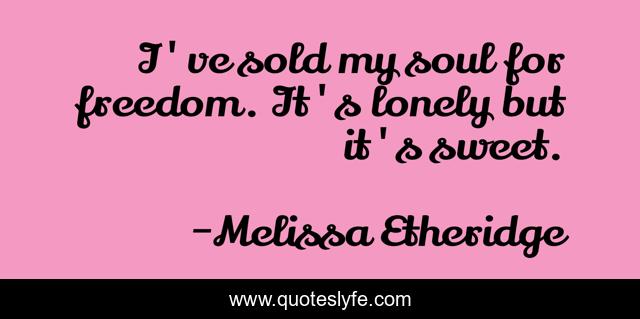 This page presents the quote "I've sold my soul for freedom. It's lonely but it's sweet.". Author of this quote is Melissa Etheridge. This quote is about sweet, lonely, soul,.
