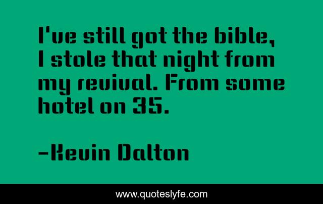 This page presents the quote "I've still got the bible, I stole that night from my revival. From some hotel on 35.". Author of this quote is Kevin Dalton. This quote is about religion, salvation, music-lyrics,.
