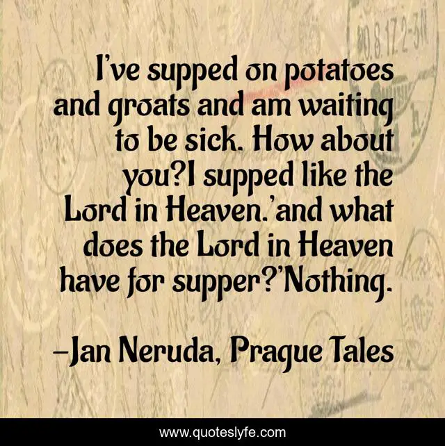 This page presents the quote "I’ve supped on potatoes and groats and am waiting to be sick. How about you?I supped like the Lord in Heaven.’and what does the Lord in Heaven have for supper?’Nothing.". Author of this quote is Jan Neruda, Prague Tales. This quote is about food, hunger,.
