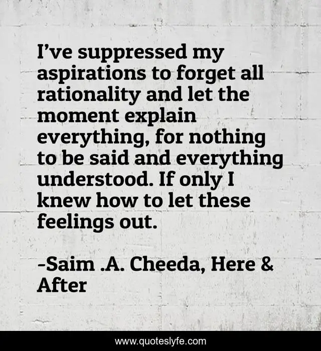 This page presents the quote "I’ve suppressed my aspirations to forget all rationality and let the moment explain everything, for nothing to be said and everything understood. If only I knew how to let these feelings out.". Author of this quote is Saim .A. Cheeda, Here & After. This quote is about denial, love, suppressing-emotions, emotions, feelings, moment, reciprocation, rationality, aspirations,.
