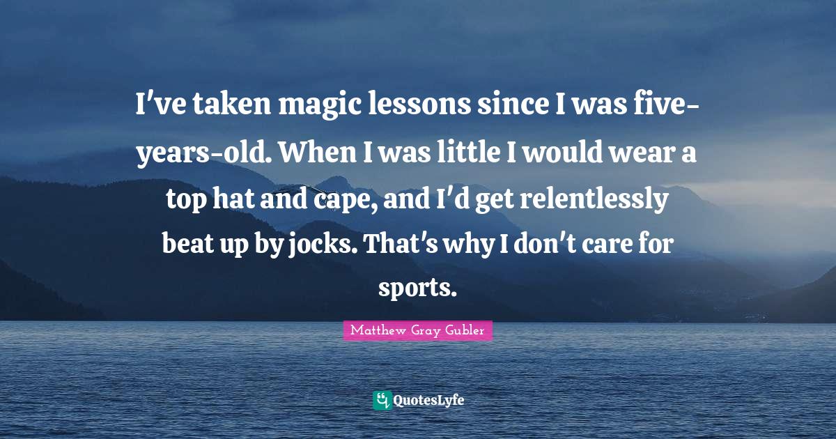 This page presents the quote "I've taken magic lessons since I was five-years-old. When I was little I would wear a top hat and cape, and I'd get relentlessly beat up by jocks. That's why I don't care for sports.". Author of this quote is Matthew Gray Gubler. This quote is about taken, lessons, i don't care, sports, magic, five, years, jocks,.