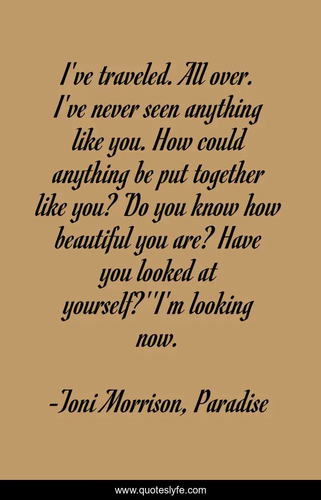 This page presents the quote "I've traveled. All over. I've never seen anything like you. How could anything be put together like you? Do you know how beautiful you are? Have you looked at yourself?''I'm looking now.". Author of this quote is Toni Morrison, Paradise. This quote is about seeing, eyes, love, beauty, see, affection,.