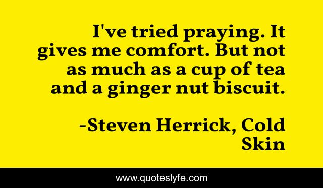 This page presents the quote "I've tried praying. It gives me comfort. But not as much as a cup of tea and a ginger nut biscuit.". Author of this quote is Steven Herrick, Cold Skin. This quote is about ginger-nut-biscuit, praying, comfort, cup-of-tea,.