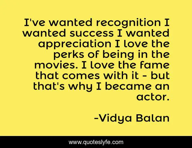 This page presents the quote "I've wanted recognition I wanted success I wanted appreciation I love the perks of being in the movies. I love the fame that comes with it - but that's why I became an actor.". Author of this quote is Vidya Balan. This quote is about appreciation, love, success, affection,.