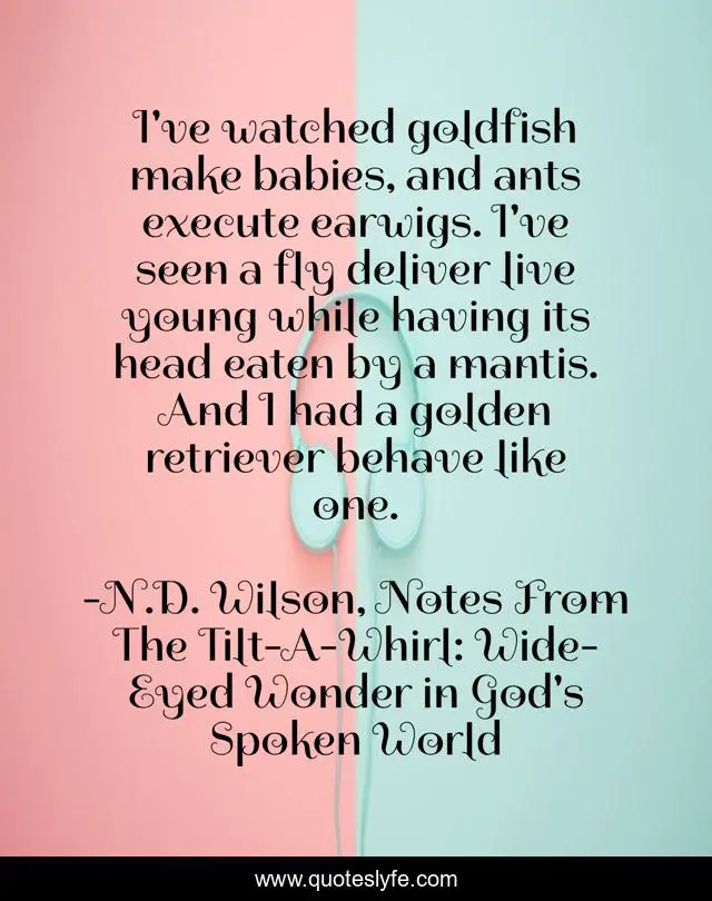 This page presents the quote "I've watched goldfish make babies, and ants execute earwigs. I've seen a fly deliver live young while having its head eaten by a mantis. And I had a golden retriever behave like one.". Author of this quote is N.D. Wilson, Notes From The Tilt-A-Whirl: Wide-Eyed Wonder in God's Spoken World. .