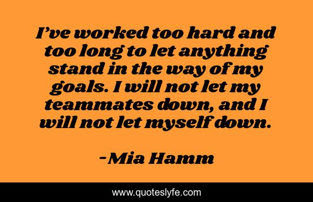 This page presents the quote "I’ve worked too hard and too long to let anything stand in the way of my goals. I will not let my teammates down, and I will not let myself down.". Author of this quote is Mia Hamm. This quote is about goals, teammates,.