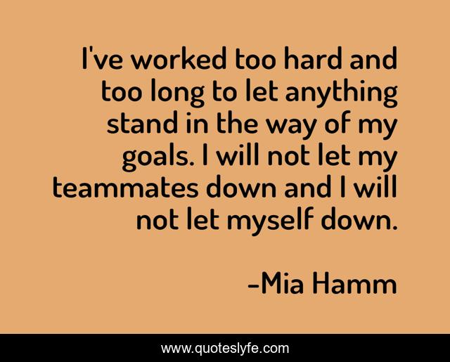 This page presents the quote "I've worked too hard and too long to let anything stand in the way of my goals. I will not let my teammates down and I will not let myself down.". Author of this quote is Mia Hamm. This quote is about myself, goals, long,.
