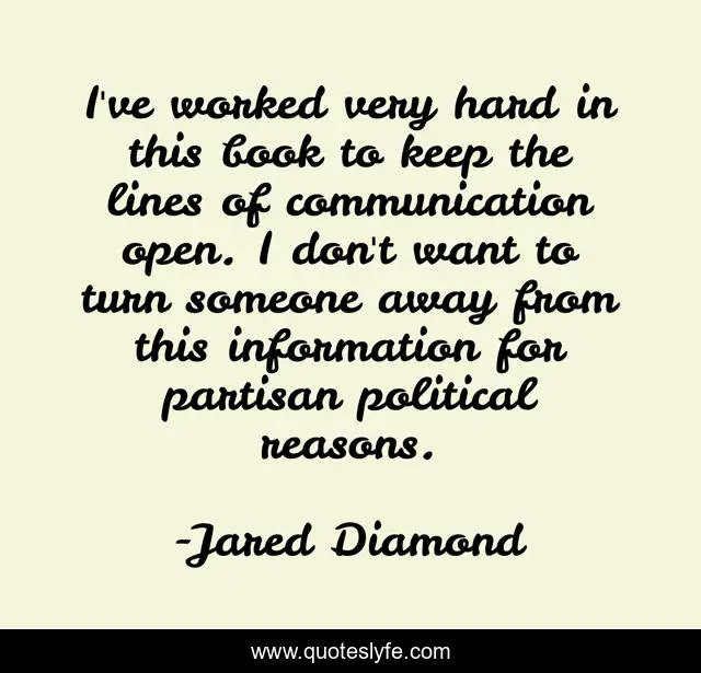This page presents the quote "I've worked very hard in this book to keep the lines of communication open. I don't want to turn someone away from this information for partisan political reasons.". Author of this quote is Jared Diamond. This quote is about information, book, political,.