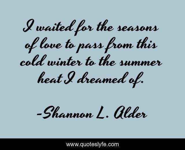 This page presents the quote "I waited for the seasons of love to pass from this cold winter to the summer heat I dreamed of.". Author of this quote is Shannon L. Alder. This quote is about summer, poets, love, winter, seasons-of-love, poems, hope, poetry, writers,.