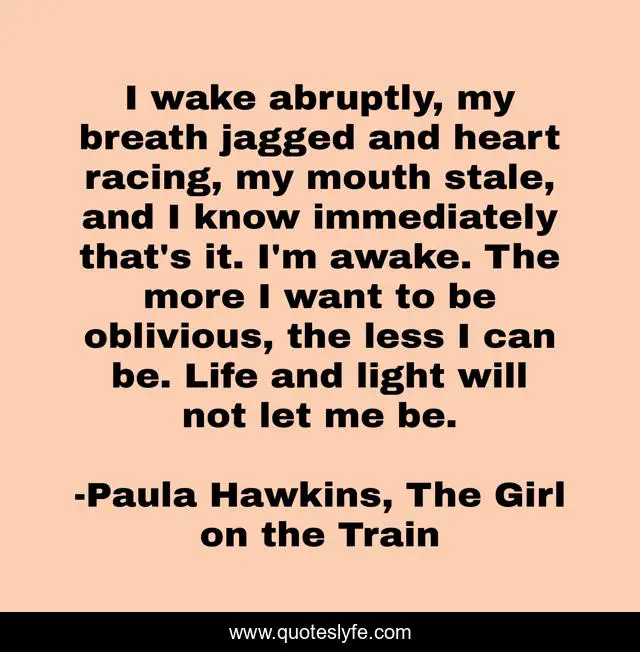 This page presents the quote "I wake abruptly, my breath jagged and heart racing, my mouth stale, and I know immediately that's it. I'm awake. The more I want to be oblivious, the less I can be. Life and light will not let me be.". Author of this quote is Paula Hawkins, The Girl on the Train. This quote is about giving-up, life, pain, loneliness, desperation,.