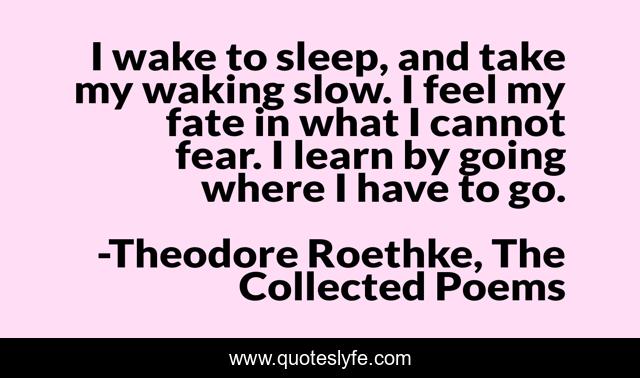 This page presents the quote "I wake to sleep, and take my waking slow. I feel my fate in what I cannot fear. I learn by going where I have to go.". Author of this quote is Theodore Roethke, The Collected Poems. This quote is about sleep, poetry,.