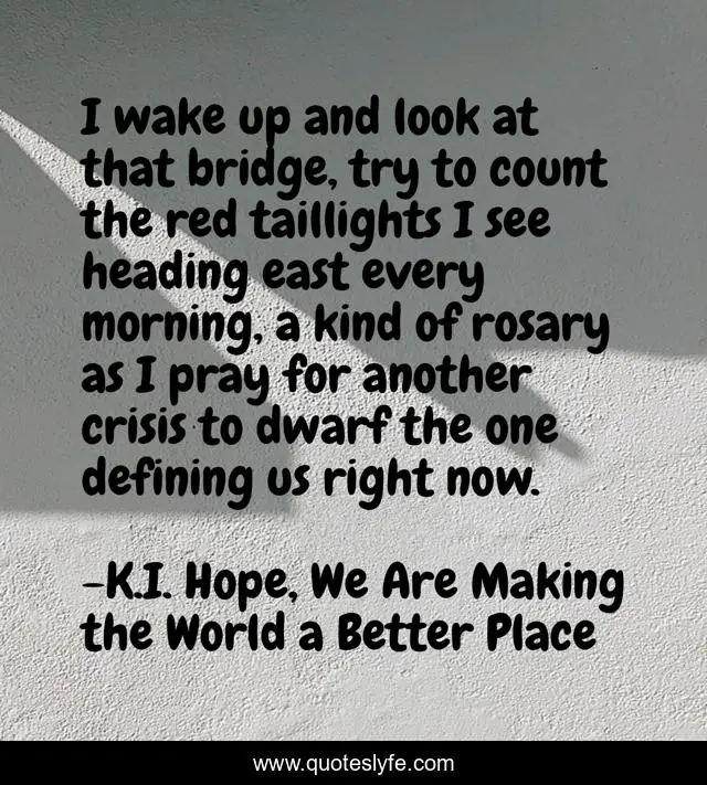 This page presents the quote "I wake up and look at that bridge, try to count the red taillights I see heading east every morning, a kind of rosary as I pray for another crisis to dwarf the one defining us right now.". Author of this quote is K.I. Hope, We Are Making the World a Better Place. This quote is about faith, literature, crisis, fiction,.