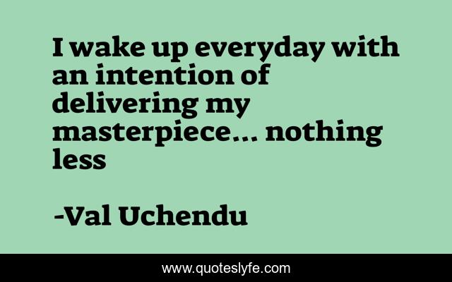 This page presents the quote "I wake up everyday with an intention of delivering my masterpiece... nothing less". Author of this quote is Val Uchendu. This quote is about confidence, daily-inspiration, motivational, optimistic, inspirational, positive, enthusiasm, daily-motivation,.