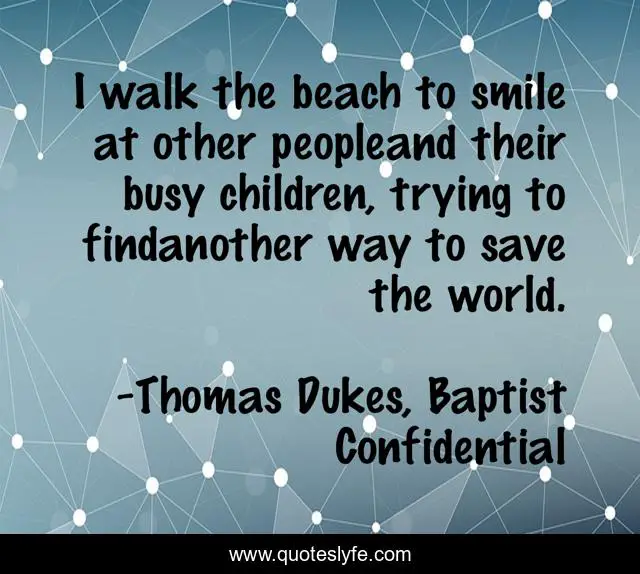This page presents the quote "I walk the beach to smile at other peopleand their busy children, trying to findanother way to save the world.". Author of this quote is Thomas Dukes, Baptist Confidential. .