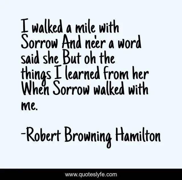 "Robert Browning Hamilton Quotes." Quoteslyfe.com, 2025. Fri. 05 Dec. 2025. <https://www.quoteslyfe.com/quote/I-walked-a-mile-with-Sorrow-And-276619>.