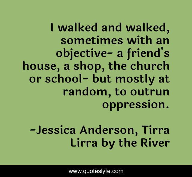This page presents the quote "I walked and walked, sometimes with an objective- a friend's house, a shop, the church or school- but mostly at random, to outrun oppression.". Author of this quote is Jessica Anderson, Tirra Lirra by the River. This quote is about oppression, random, walking,.