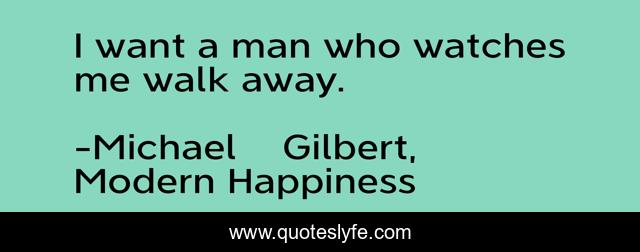 This page presents the quote "I want a man who watches me walk away.". Author of this quote is Michael Gilbert, Modern Happiness. This quote is about true-love, lovers, love, romantic, romance, happiness, women-and-men, affection,.