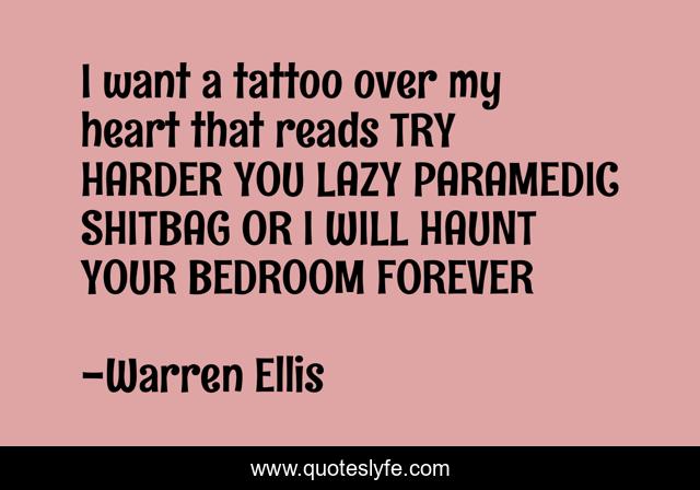 This page presents the quote "I want a tattoo over my heart that reads TRY HARDER YOU LAZY PARAMEDIC SHITBAG OR I WILL HAUNT YOUR BEDROOM FOREVER". Author of this quote is Warren Ellis. This quote is about tattoos, first-aid, inspirational, enthusiasm,.