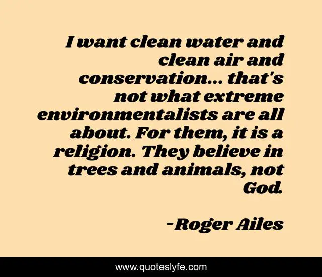 This page presents the quote "I want clean water and clean air and conservation... that's not what extreme environmentalists are all about. For them, it is a religion. They believe in trees and animals, not God.". Author of this quote is Roger Ailes. This quote is about water, god, believe,.