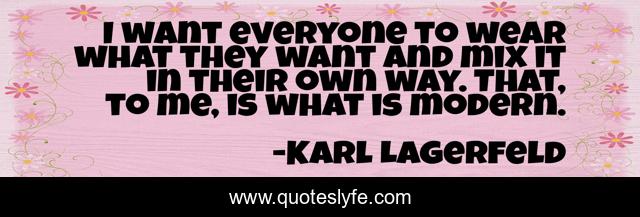 This page presents the quote "I want everyone to wear what they want and mix it in their own way. That, to me, is what is modern.". Author of this quote is Karl Lagerfeld. This quote is about style, fashion, look, mix, quote, image, modern, karl-lagerfeld, designer,.