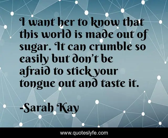 This page presents the quote "I want her to know that this world is made out of sugar. It can crumble so easily but don’t be afraid to stick your tongue out and taste it.". Author of this quote is Sarah Kay. This quote is about poem, advice, poetry, inspirational, enthusiasm,.