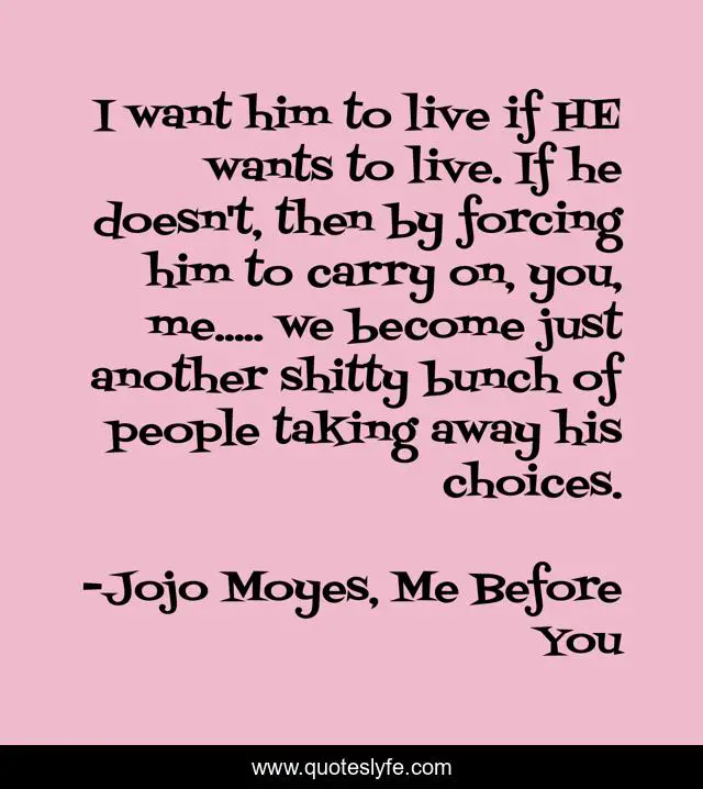 This page presents the quote "I want him to live if HE wants to live. If he doesn't, then by forcing him to carry on, you, me..... we become just another shitty bunch of people taking away his choices.". Author of this quote is Jojo Moyes, Me Before You. This quote is about freedom, suicide, choice,.