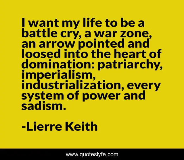 This page presents the quote "I want my life to be a battle cry, a war zone, an arrow pointed and loosed into the heart of domination: patriarchy, imperialism, industrialization, every system of power and sadism.". Author of this quote is Lierre Keith. This quote is about power, food, industrialization, justice, domination, imperialism, oppression, patriarchy,.