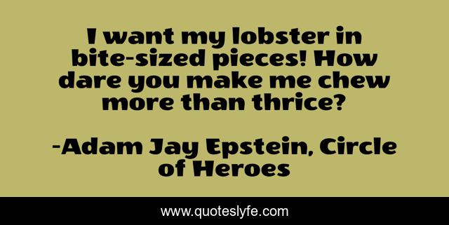 This page presents the quote "I want my lobster in bite-sized pieces! How dare you make me chew more than thrice?". Author of this quote is Adam Jay Epstein, Circle of Heroes. This quote is about food, funny, comedy, humor, arrogant,.