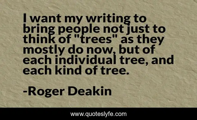 This page presents the quote "I want my writing to bring people not just to think of "trees" as they mostly do now, but of each individual tree, and each kind of tree.". Author of this quote is Roger Deakin. This quote is about ambition, see, observe, tree, writing,.