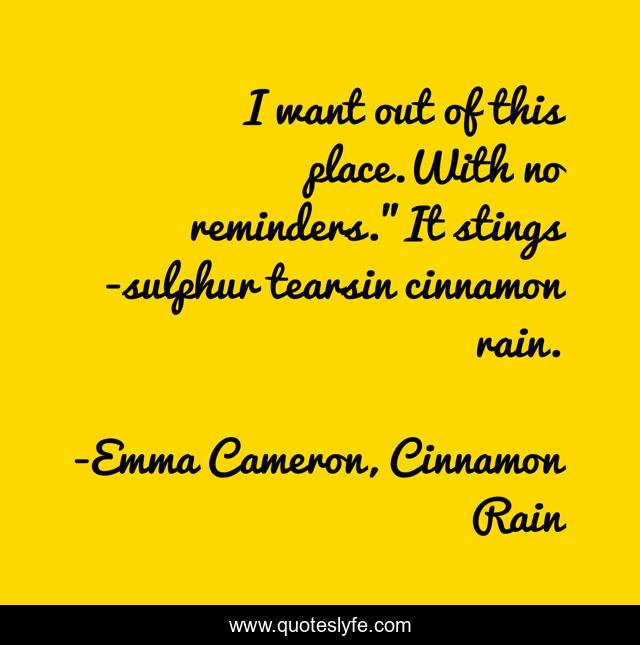 This page presents the quote "I want out of this place.With no reminders."It stings -sulphur tearsin cinnamon rain.". Author of this quote is Emma Cameron, Cinnamon Rain. This quote is about cinnamon-rain, tears, no-reminders, stings, want-out,.